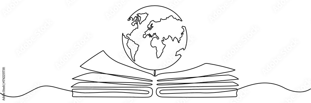 Continuous line drawing open book with Earth globe. World knowledge concept. Vector illustration isolated on white. #1762251738