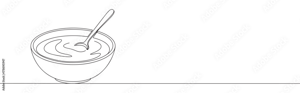 Continuous one line drawing of a bowl with a spoon. Concept of food, eating and healthy lifestyle #1786145947