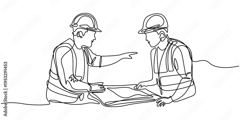Continuous one line drawing of two construction workers in hard hats and safety vests pointing vector, Two male engineers standing in hard hat Continuous one line drawing, two construction workers #1953291453
