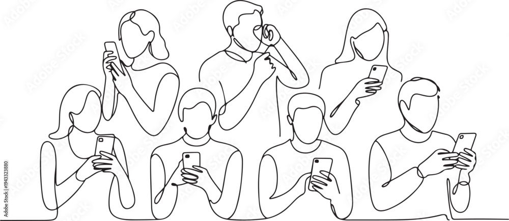 Continuous one line drawing People holding, using mobile phones. Single line draw design vector graphic illustration. one line Icon drawing #1943323880