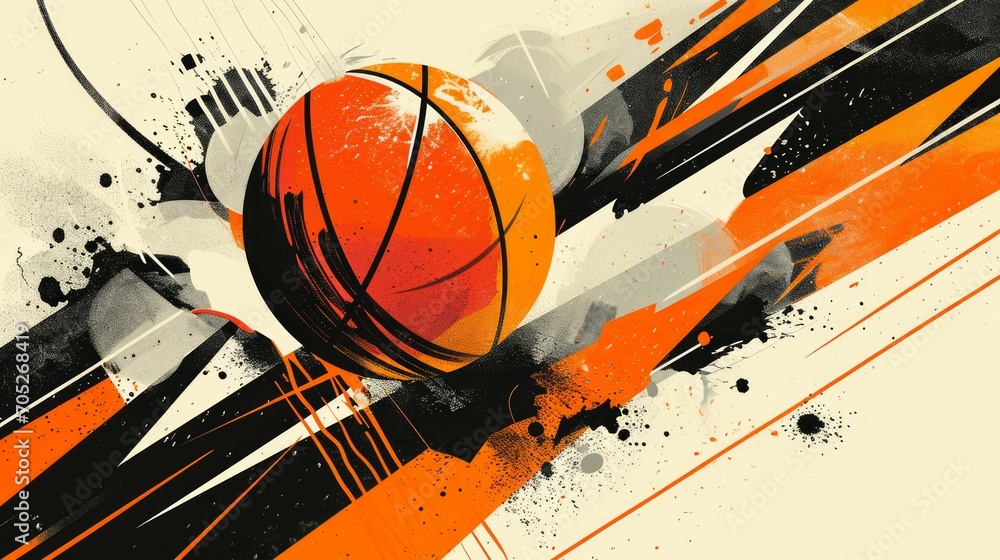 Convey the excitement of basketball, with abstract shapes suggesting movement and competition, using bold oranges and blacks #705268419