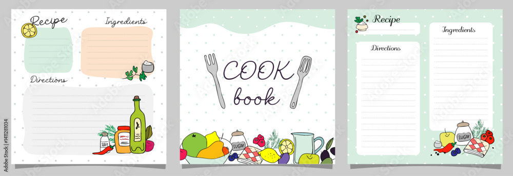 cook book blanks , set of square page, card, doodle drawn vegetable and fruits, kitchen reminder, template vector illustration #1411281034