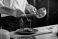 Cook in apron adding some sauce to dish. Cropped chef preparing food, meal, in kitchen, chef cooking, Chef decorating dish, closeup #417718860