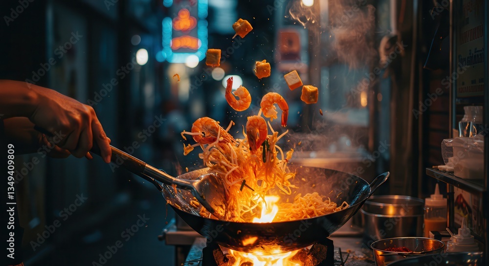 Cooking Pad Thai on Street Food Stall with Shrimp and Tofu #1349409809