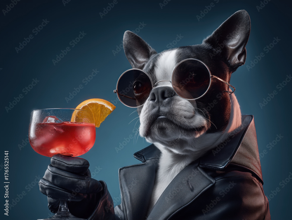 Cool Boston Terrier Dog in Leather Jacket with Red Cocktail #1765525141
