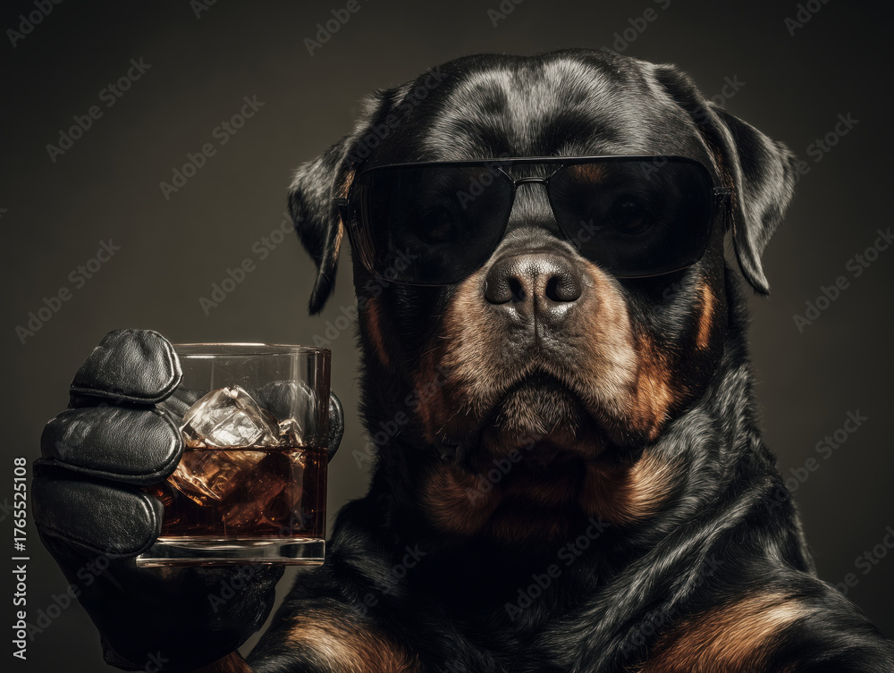 Cool Rottweiler Dog in Sunglasses with Glass of Whiskey #1765525108