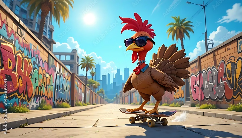 Cool Skateboarding Turkey Cartoon for Funny Thanksgiving Design | A hilarious cartoon of a turkey wearing sunglasses and riding a skateboard, perfect for humorous Thanksgiving graphics, cards #1405697841