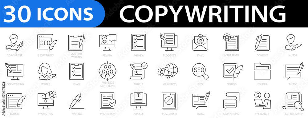 Copywriting line icon set. copywriter, marketing, content writing, editing, blog, article, email, storytelling, writer, author, folder and more. Vector illustration #1746478222