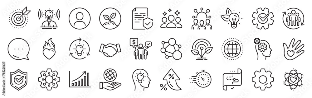 Core values line icons. Settings gear, Message, Inflation icons. Integrity, Target purpose and Strategy. Trust handshake, social responsibility, commitment goal icons. Vector #1785228637
