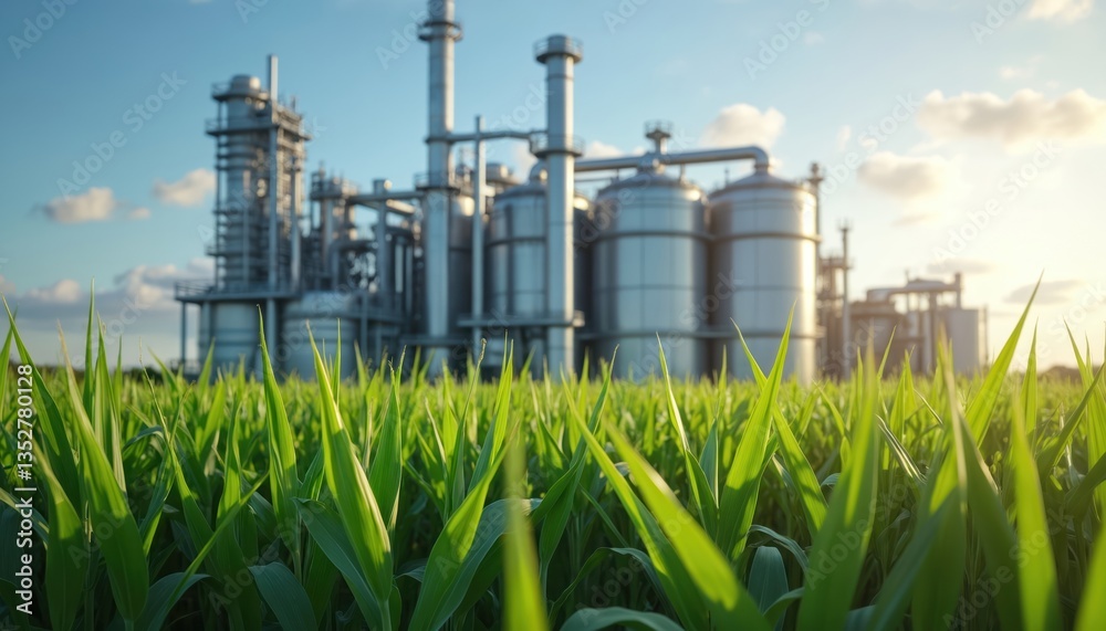 Corn field with ethanol plant, industrial factory complex. Agriculture eco concept. Eco-friendly green energy, bio fuel production. Renewable energy. Summer landscape with blue sky, clouds. #1352780128