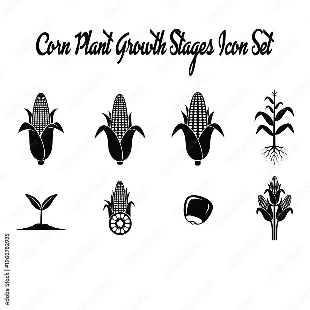 Corn plant growth stages icon set in black and white background #1960782925
