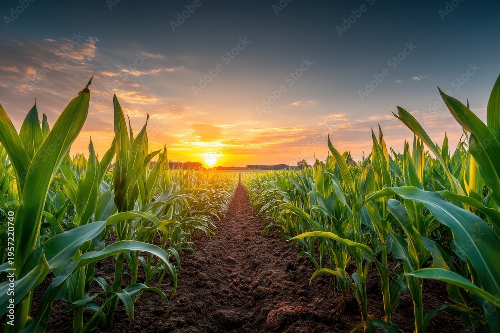 Cornfield at Sunrise: Golden Hour Agriculture Landscape with Rows of Corn Stalks and Dramatic Sky #1957220740