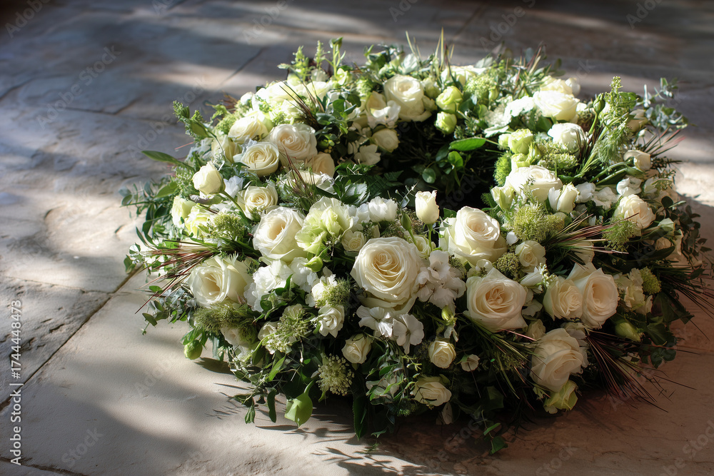 Corona de flores blancas y crema con follaje verde sobre superficie de piedra. Arreglo ceremonial para homenajes, funerales o actos conmemorativos que evocan respeto, paz y belleza natural. #1744448473