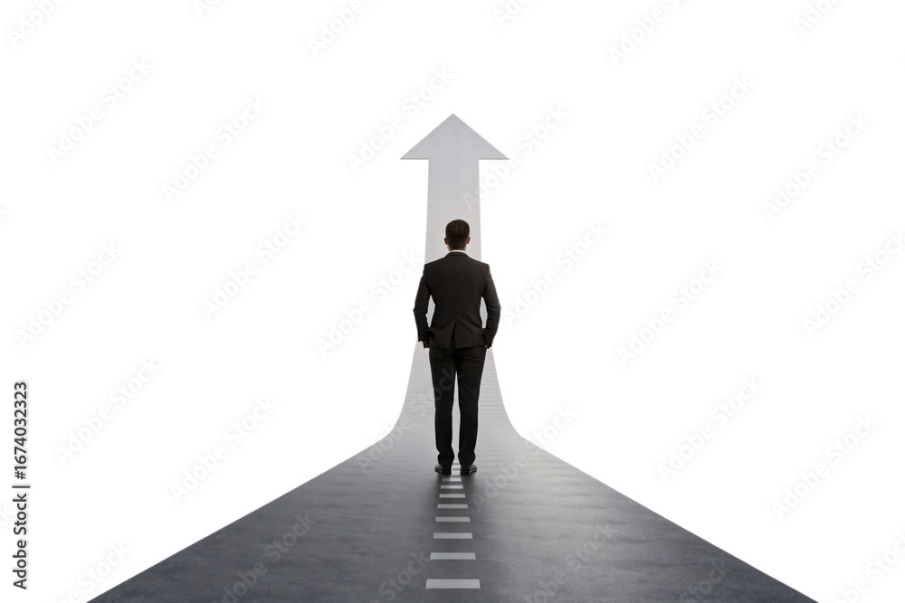 Corporate figure walking on dotted line toward upward arrow showing strategic planning and leadership, isolated on a transparent background #1674032323