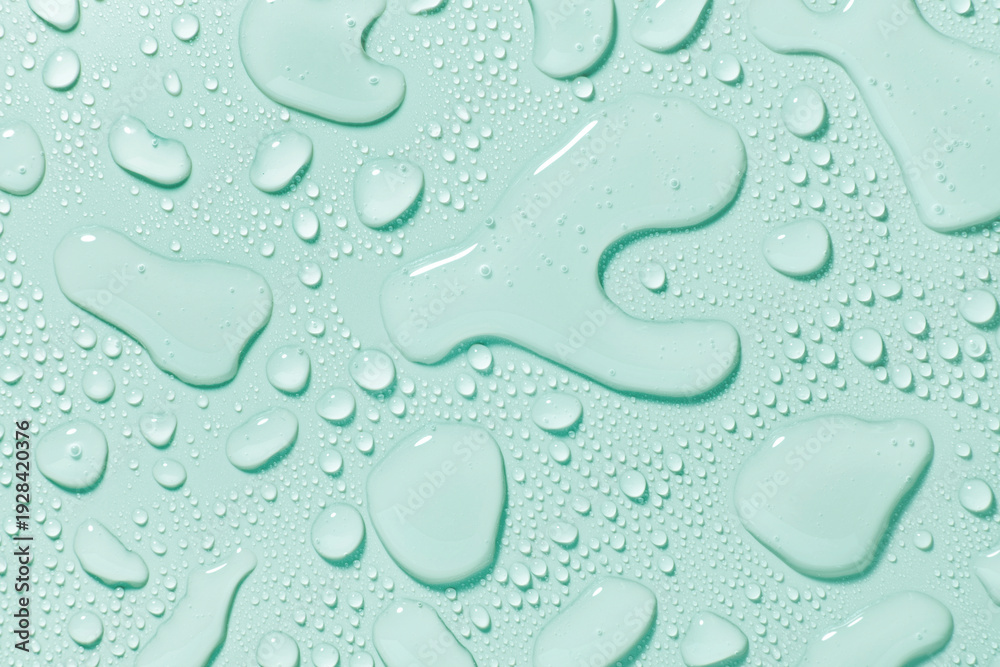 Cosmetic moisturizing liquid drops on grey pastel background. Toner or lotion. Hyaluronic serum or micellar water #1928420376