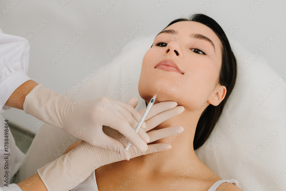 Cosmetic procedure using botulinum toxin to enhance chin and jawline balance. Botulinum toxin chin injection close-up. Botulinum toxin chin injection for smoother definition and symmetry. #1788498464