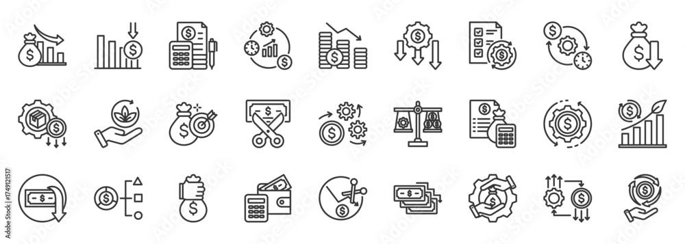 cost reduction icon set collection in outline style. icon pack contain savings, efficiency, cut, reduce, optimize, lower, minimize, control, budget, slash #1749121517