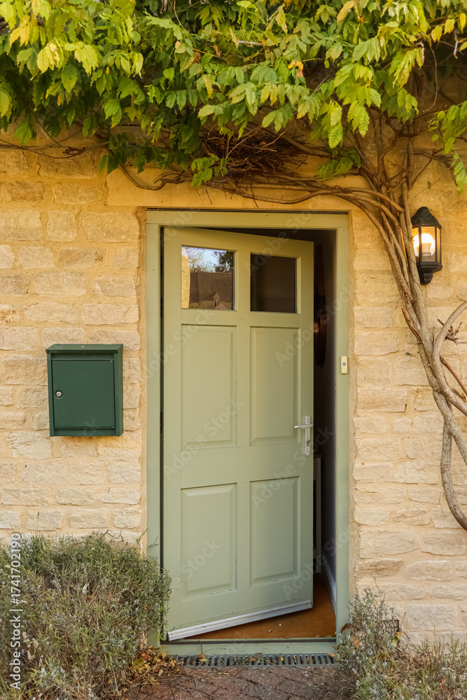 Cottage front door slightly ajar, inviting welcoming to a cozy home entrance. Cotswolds countryside, England #1741702190