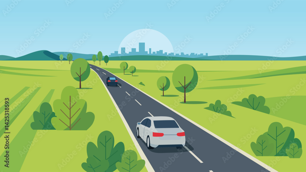 • #1425318593 Countryside road leading to a distant city, with cars driving through green fields, rolling hills, and stylized trees under a clear blue sky.