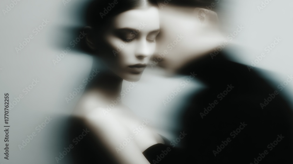 Couple embraces in soft focus, capturing an intimate moment during a fashion-inspired photo shoot #1770762255