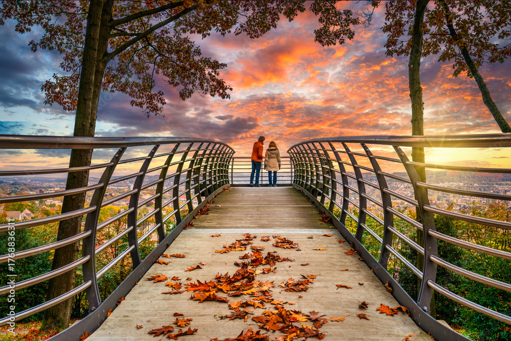 Couple enjoy beutiful sunrise Wuppertal from Skywalk Nordpark deck in autumn #1768836311
