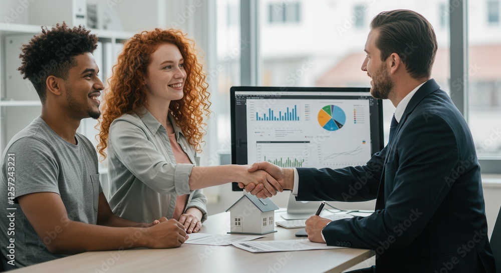 Couple handshake mortgage officer worker, accept bank loan terms and rates feel satisfied. Make financial deal, take credit, buying insurance cover, receive professional consult, sign contract concept #1257243221