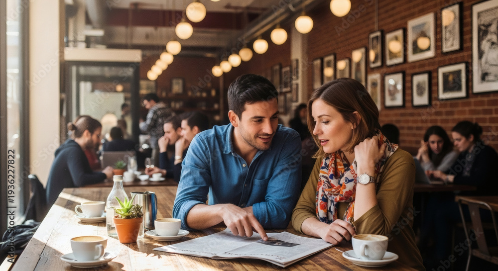 Couple on Date in Cozy Cafe, Looking at Menu, Enjoying Coffee and Each Other's Company #1936227822