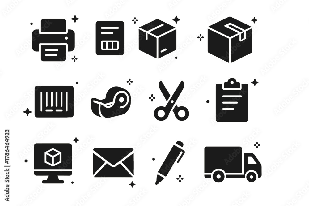 Courier Service Icons. Courier Services. Solid icons set of Courier Services: printer, shipping label, package, box, barcode, tape dispenser, scissors, #1786464923