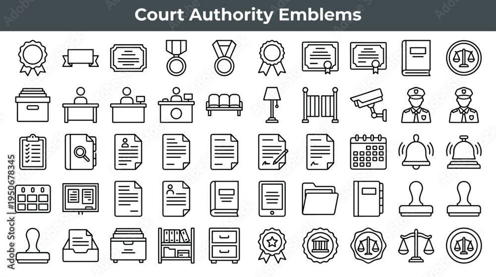 Court authority emblems and legal institution imagery illustrated as minimal outline icons representing visual identifiers of the #1950678345