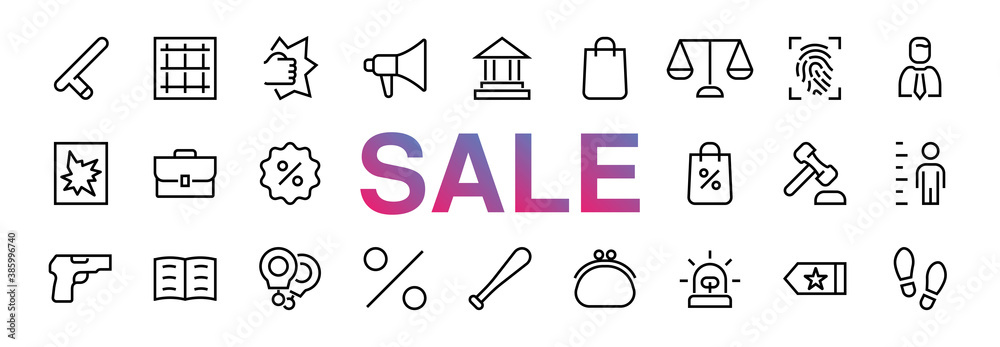 Court, Law and Justice Icon Set contains such icons as Law, Police, Prison, Handcuffs, Pistol, Editable stroke. Modern subtle symbols black friday #385996740