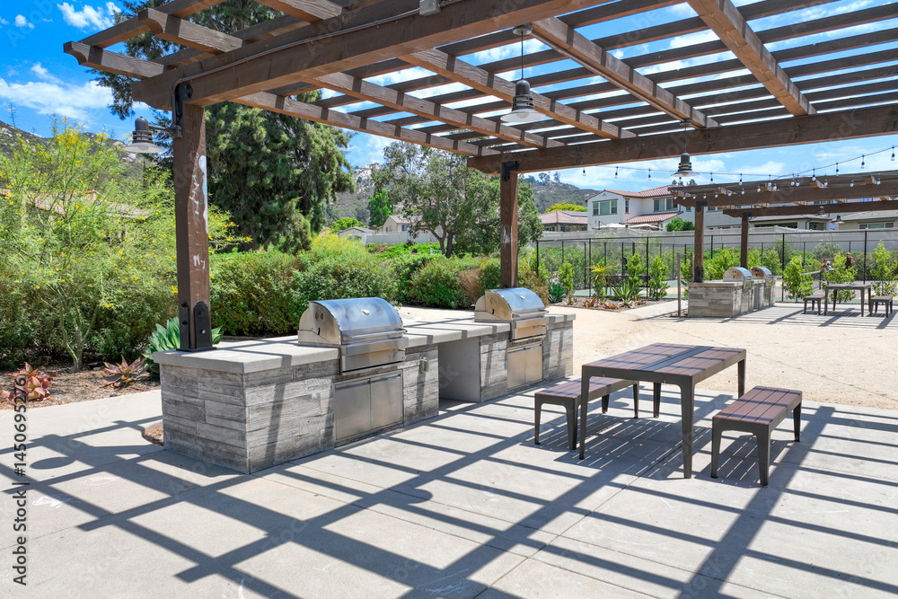 Covered gathering area in community park with picnic tables, Escondido, San Diego, California #1450695276