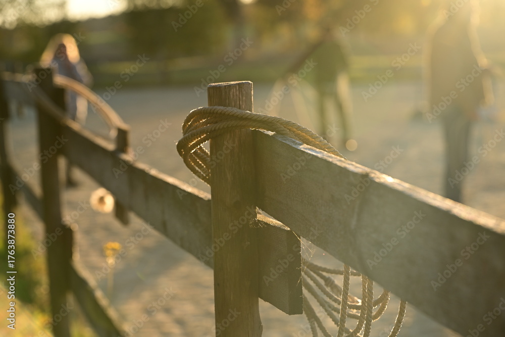 Cowboylife. Stilleben, Lasso an einem Holzzaun in der Abendsonne, im Hintergrund unscharf ein Cowboy #1763873880