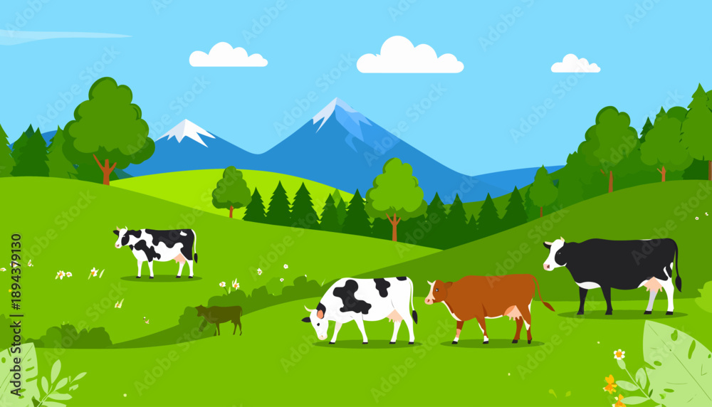 Cows Grazing in a Green Meadow Landscape #1894379130
