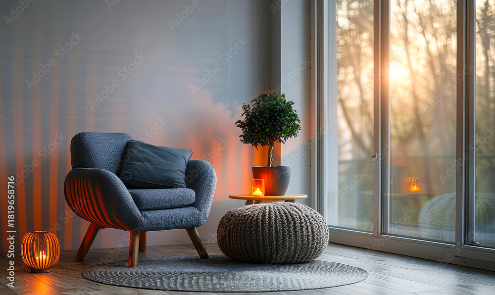 Cozy Armchair and Pillow in Modern Living Room with Luminous Lamp, Potted Plant on Side Table, Ottoman, and Round Carpet at Sunset, Creating a Warm and Inviting Atmosphere for Relaxation and Reading #1819658716
