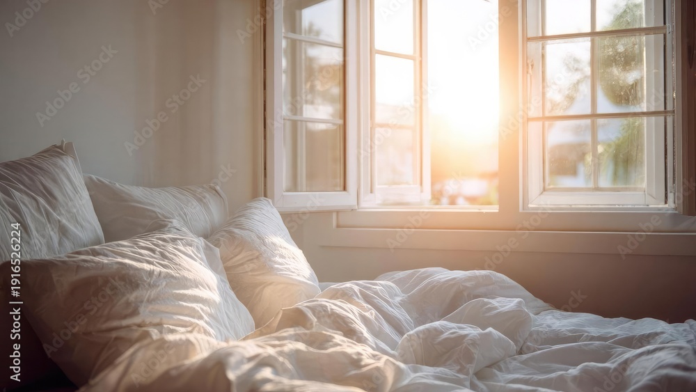 Cozy bed with white sheets and pillows bathed in warm morning sunlight streaming through open windows. Concept Cozy Morning Bedroom, Sunlit White Sheets, Open Window Light, Warm Natural Glow #1916526224