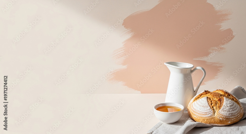 Cozy breakfast and favorite delicacy with milk, honey and fresh bread, minimalistic style, delicate pastel colors, background for copying #1971274412