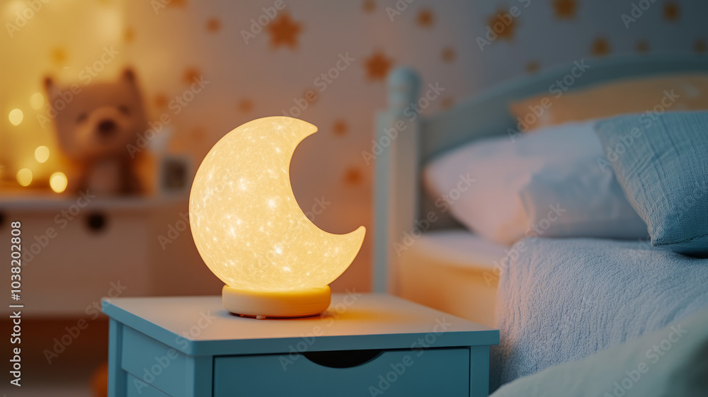 Cozy children's bedroom with moon lamp on nightstand #1038202808