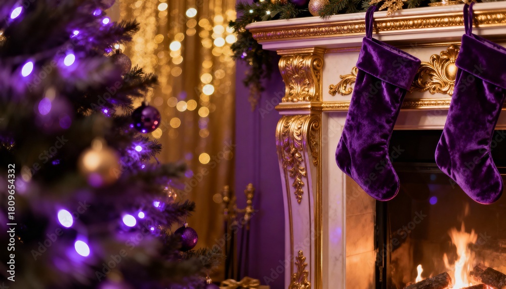 Cozy Christmas interior background with decorated tree on the left and hanging stockings on fireplace mantle. Festive holiday atmosphere with candles and bokeh lights. #1809654332