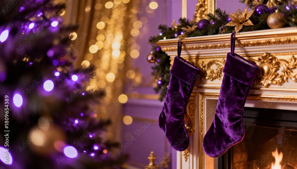 Cozy Christmas interior background with decorated tree on the left and hanging stockings on fireplace mantle. Festive holiday atmosphere with candles and bokeh lights. #1809654389