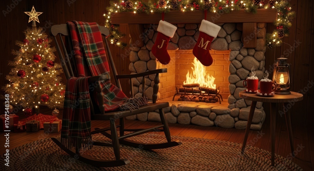 Cozy christmas scene with fireplace stockings tree rocking chair and hot cocoa #1767548368