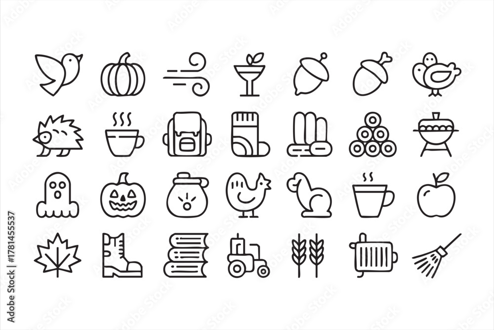 Cozy fall vector icon collection featuring pumpkin, apple, acorn, and coffee #1781455537