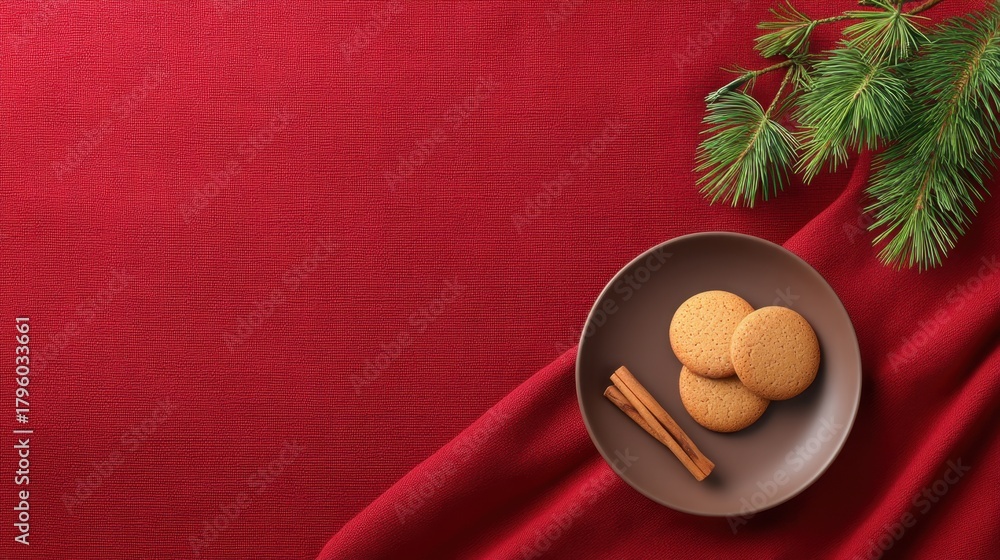 Cozy Festive Scene with Cinnamon Sticks and Ginger Cookies on a Red Tablecloth Surrounded by Pine Needles for Holiday Celebration and Winter Vibes #1796033661