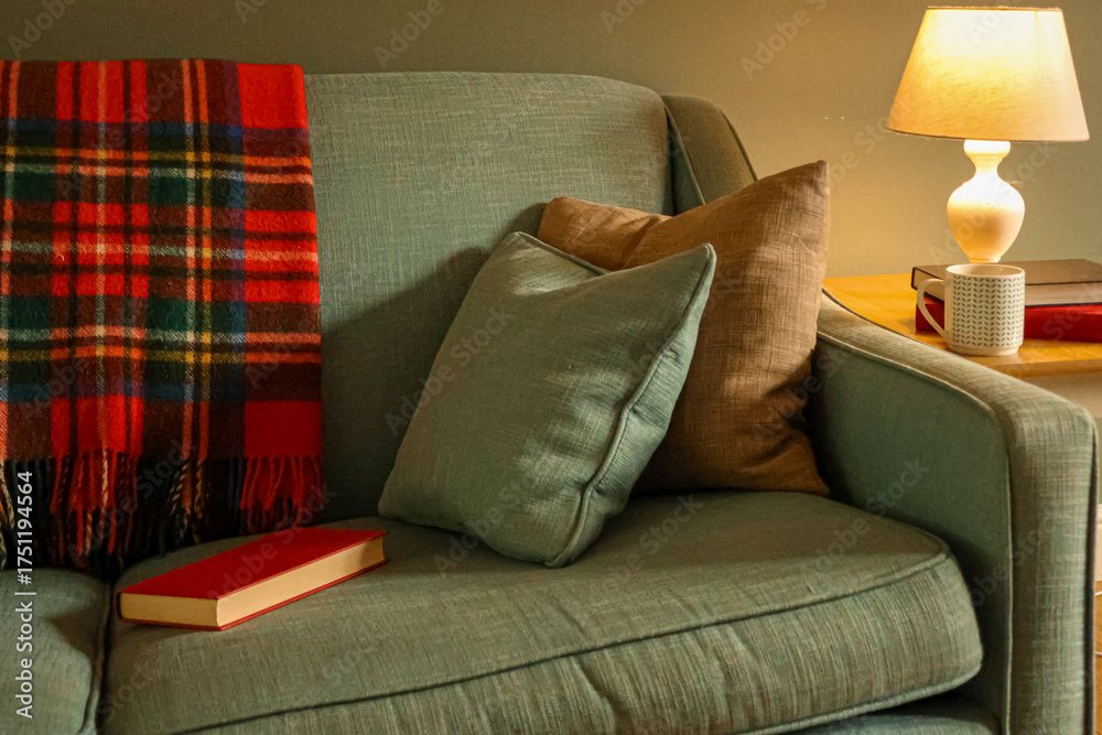 Cozy home interior with a plaid blanket and book on a couch, creating a warm, comfortable reading nook #1751194564