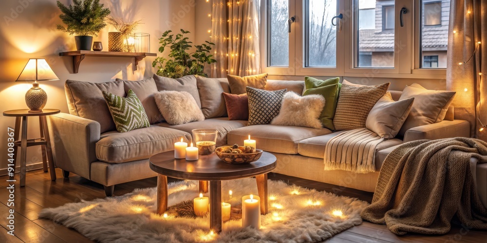 Cozy living room with plush pillows, soft blankets, and warm lighting , Hygge, comfort, home, relaxation, security #914408367