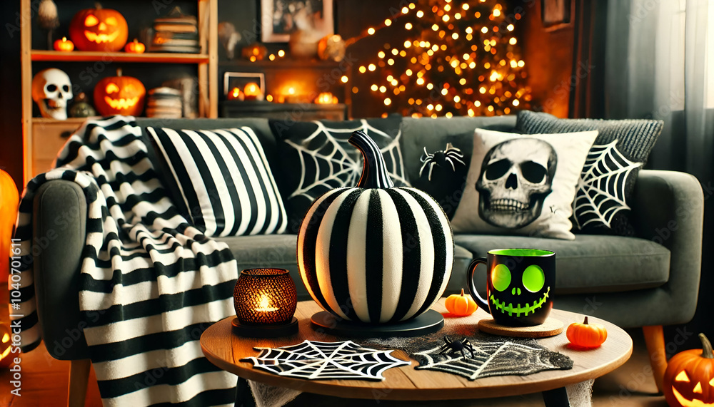 Cozy Living Room with Striped Pumpkin Centerpiece, Black-and-White Halloween with Bright Green Accents and Spider-Web Decor, Striped Pumpkin and Green Skull Mug, Wall Art, 4K Wallpaper, Frame TV Art #1040701611