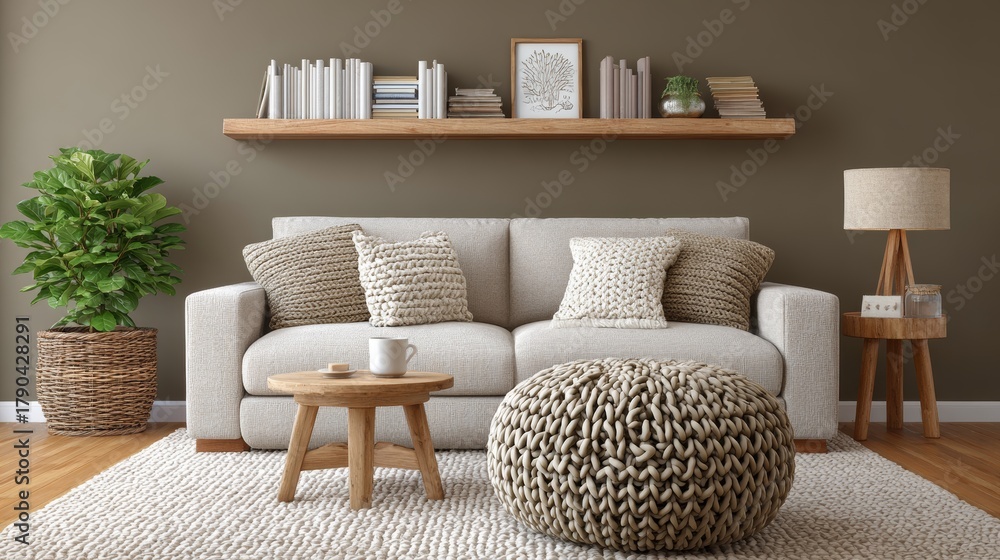 Cozy scandinavian living room interior design with earth toned furniture and textiles inviting atmosphere #1790428291