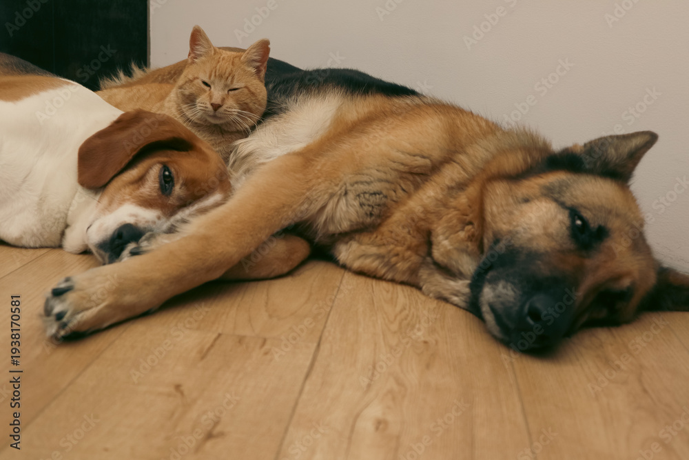 Cozy scene of a ginger cat sleeping comfortably between two large dogs on the floor at home #1938170581