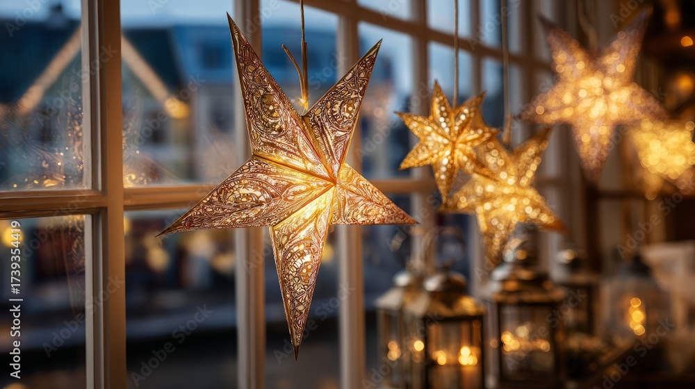 cozy swedish christmas window decoration with golden star pendant lights in a carton display case, showcasing warm holiday glow and scandinavian festive charm for magical winter interior design inspir #1739354419
