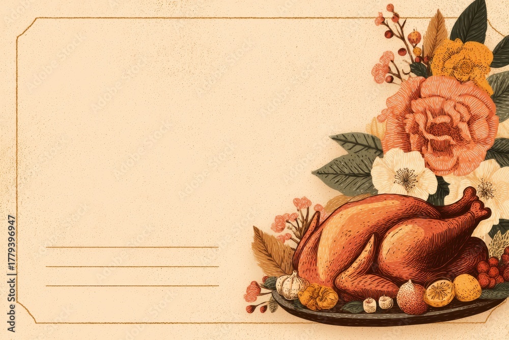 Cozy thanksgiving dinner invitation tag rustic home illustration warm retro style #1779396947