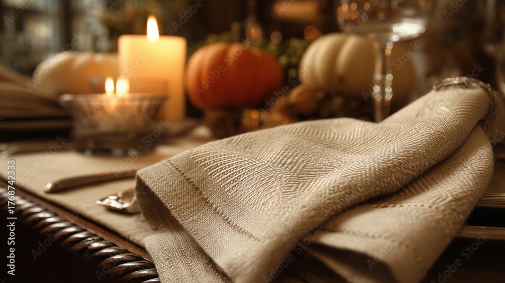 Cozy Thanksgiving dinner table setup with napkin and warm candlelight #1768742333